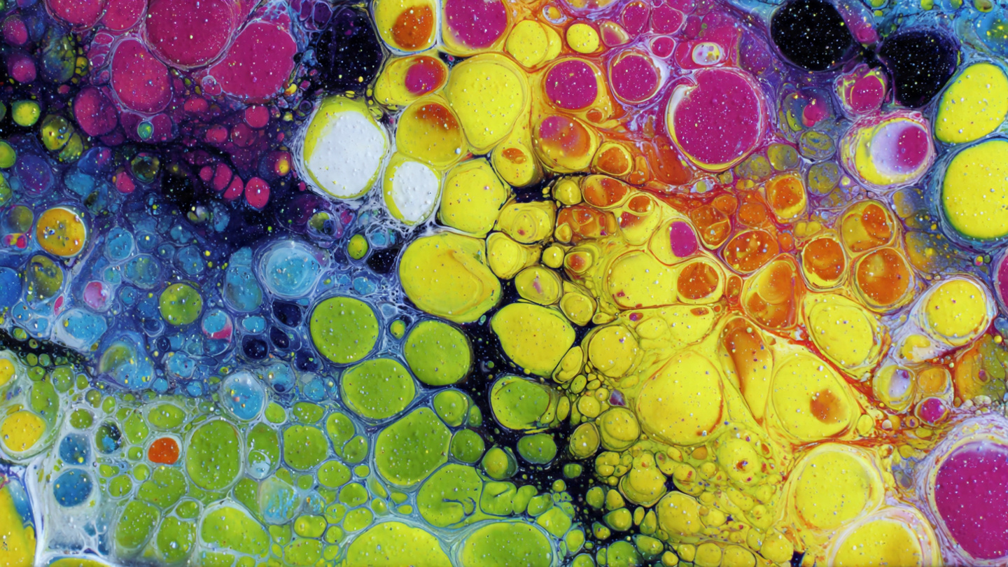 This vibrant abstract piece features a captivating mosaic of interconnected circles and organic shapes. A rich spectrum of colors unfolds across the composition, with luminous yellows, striking pinks, cool blues, and fresh greens forming distinct clusters. Within many of the cells, smaller, contrasting dots and specks are visible, adding a playful, effervescent quality. The colors flow and merge, creating a dynamic interplay between distinct hues and subtle gradients. The overall impression is one of lively movement and intricate natural patterns, reminiscent of microscopic life or bubbling liquids, all coming together in a harmonious, energetic display.